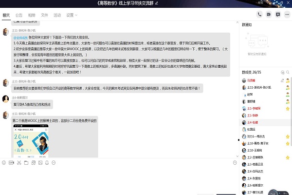 为了积极应对新型冠状病毒感染的肺炎疫情,按照学校《关于做好2019-2020年度第二学期本科课程线上教学工作的通知》要求,在保障学生身体健康的基础上,学院依托网上学业指导中心平台,深入开展学院“优良学风攀升计划”——“晓知行‘疫’同学习”学业帮扶活动。前期,各年级辅导员老师协同教务员老师开展了学生学业普查,督促学业困难学生或考试不及格较为严重学生制定学业提升计划,并将学生列入学业困难重点帮扶学生名单,通过网络平台进行多次谈心谈话,了解日常学习状态。同时,学院网上学业指导中心在学习成绩优异的团学骨干中遴选20名学生组建“朋辈讲师团”,针对《高等数学》、《理论力学》等重难点课程,采取网络视频集中辅导课程、“一对一”针对性结对帮扶等方式相互学习、交流、沟通和帮扶,帮助学业困难学生提高学习能力和备考成效。