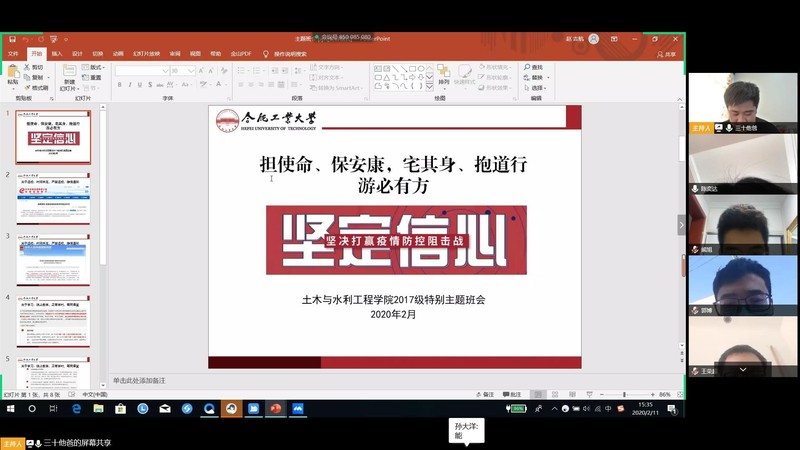 本次疫情防控线上主题班会充分利用网络新媒体技术,跨越空间障碍,发挥线上实时互动的优势,不仅加强了广大土木学子的自我教育、自我管理和自我服务,让他们对疫情防控期间的纪律要求、线上教学工作安排、第二课堂活动组织等有了更加深刻的了解和认识,也展现了土木学子为抗击疫情贡献力量的信心和担当。我们坚信,万众一心、众志成城,与祖国一起,与人民一道,一定能战胜疫情,打赢这场疫情防控阻击战。