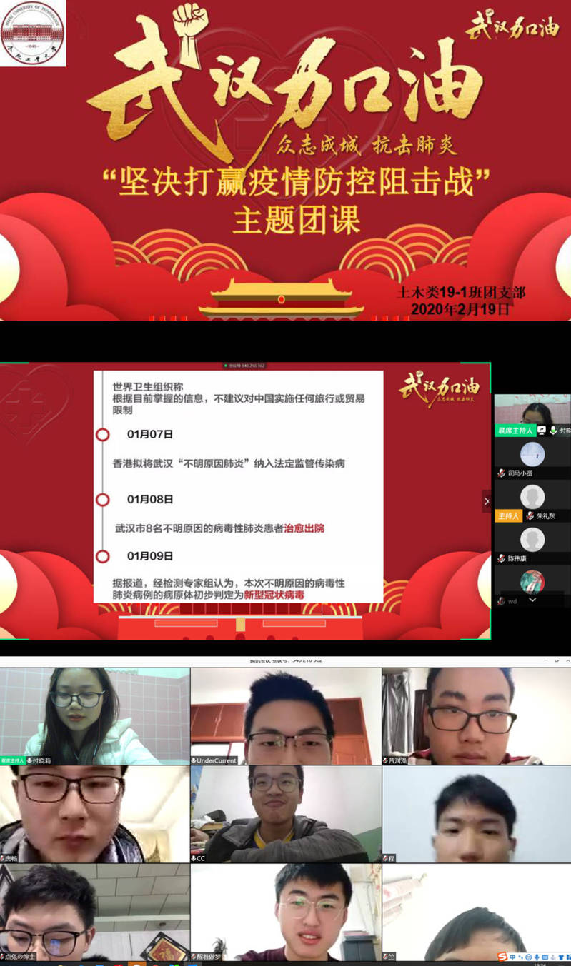 土木工程18-1班团支部全体团员在微信平台线上学习后,集体录制《武汉加油》祝福视频,致敬一批批不畏艰险、意志坚定、逆向而行、前赴后继的医疗战士们,祈祷他们早日打赢疫情防控阻击战,平安归来。土木类19-1班团支部通过腾讯会议平台开展主题团课,各位团员同学使用电子设备加入会议,进行集中线上学习讨论。团支部书记付晓莉向同学们讲解了有关新型冠状病毒的知识及当前我国疫情防控工作取得的成就。党有号召团有行动,他号召班级共青团员积极行动起来,在群众之中发挥先锋模范作用。支部团员青年纷纷表示认同,部分在家乡参加过疫情防控志愿服务工作的同学向大家讲述了自己的工作经历和感悟,呼吁大家积极为疫情防控工作贡献青年力量。班级QQ群讨论中,广大团员青年们对强大祖国战胜此次疫情充满信心,纷纷表示认真遵守规定,安心做好线上学习,呼吁保护生态环境,不猎杀、食用野生动物,为患病同胞祈福,为广大医务工作者、火神山、雷神山建设者,安保人员点赞,为武汉加油,为祖国加油。