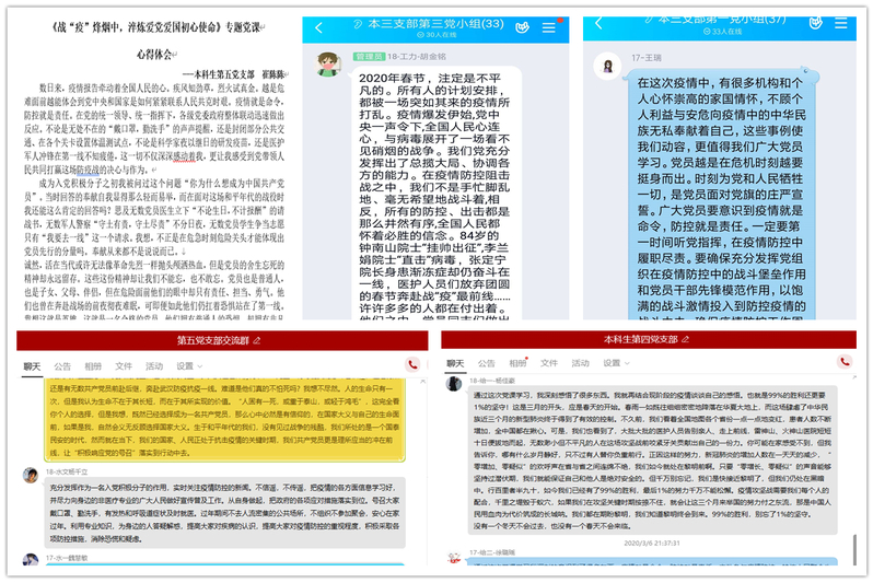 党课结束后,同学们纷纷发表学习体会,本科生第五党支部书记陈灵蔚说到:“本次党课更加坚定了我对祖国打赢疫情阻击战的信心,中国人民在疫情防控中展现的中国力量、中国精神、中国效率,既展现了负责任大国形象,又生动谱写了可歌可泣的英雄篇章,诠释了凝聚中华民族磅礴伟力的伟大精神。对比国外面对疫情挑战的一些应对措施和情况,我们能更加能证明我们的党集中力量办大事的能力,更能感受到中国政治制度的优势!”“此次疫情所带来的启示和影响,对于我们普通学生党员来说将是一个长远考验和终身课题,本次党课更加启发了我作为一名新时代大学生党员,今后要持续学习思考、坚定信念、勇于担当,为夺取战疫全面胜利和中华民族伟大复兴“中国梦”不懈奋斗!”本科生第一党支部党员张玉冰说。