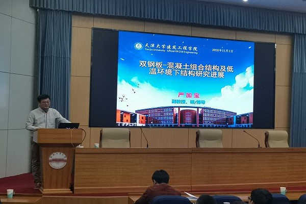 严加宝副教授的报告是“双钢板-混凝土组合结构及低温环境下结构研究进展”。他介绍在双钢板-混凝土组合结构构件的受弯、受剪、受冲剪及抗震性能等方面的试验和理论研究进展,以寒区为背景,总结近年来在低温环境下结构构件力学性能研究进展。