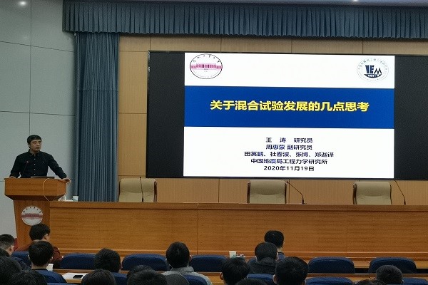 王涛研究员的报告是“关于混合试验的几点思考”。他讲述了混合试验的基本概念和发展历史,介绍了几种分布式混合试验技术,重点讲解了关键技术问题,比如隐显式协同方法、复杂边界协调技术等,还介绍了子结构混合试验最新研究进展,最后对混合试验的主要核心问题发表了自己的见解。
