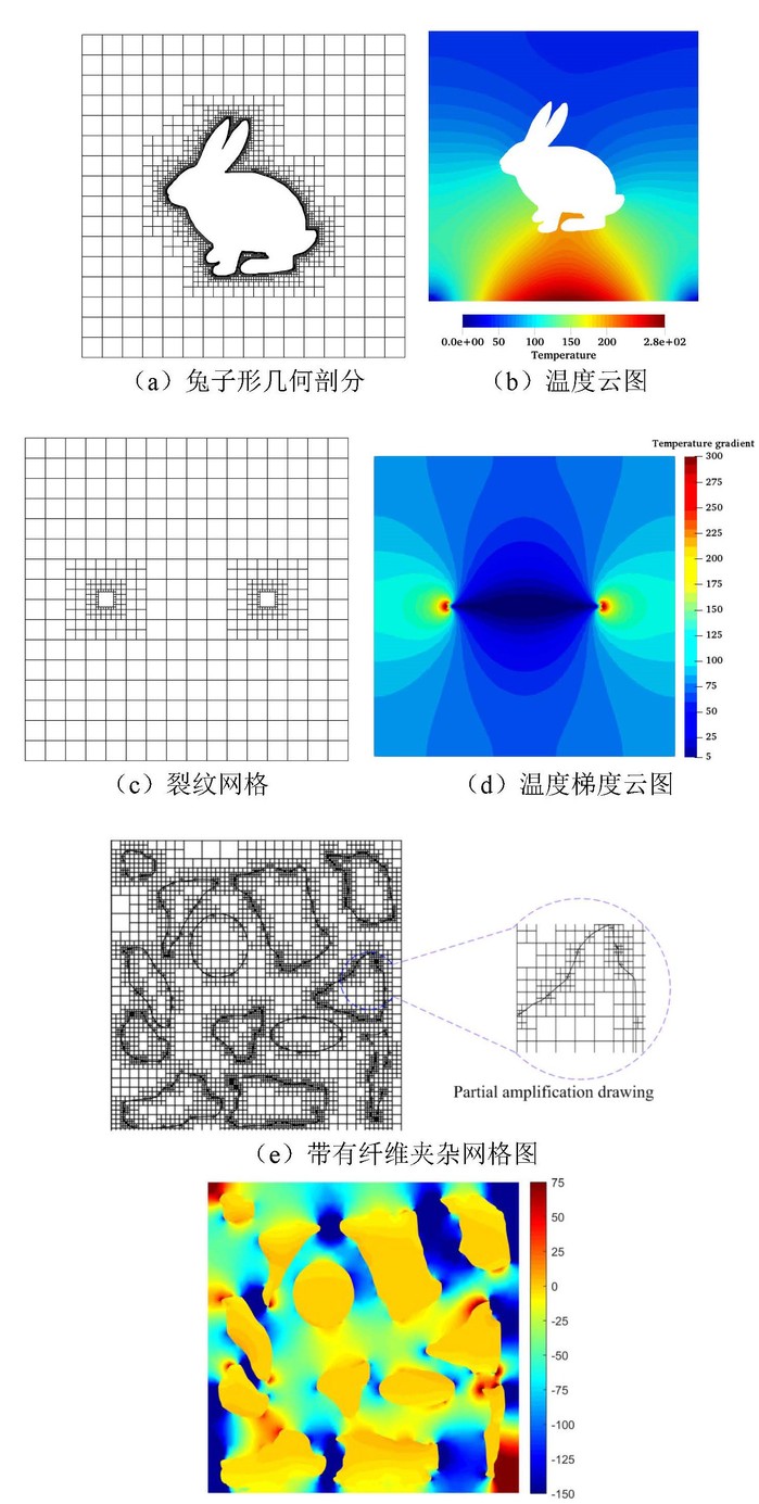 SBFEM是一种半解析数值方法,尤其在求解含裂纹问题(裂纹尖端无需加密)、无限域问题时具有独到的优势。SBFEM对所使用的单元要求相比有限元法要灵活的多,针对SBFEM只需满足比例中心要求即可,单元可以是任意多边形(自然避免了悬挂节点问题),甚至是对较为畸形的单元SBFEM仍然可以成功求解。为此研究团队基于混合四叉树网格对瞬态传热问题进行了系统地研究,内容涉及复杂几何形状、单/双材料裂纹、纤维夹杂及裂纹扩展问题。该文展示了该方法高效的计算效率,尤其在处理裂纹、纤维夹杂问题时的巨大优势。