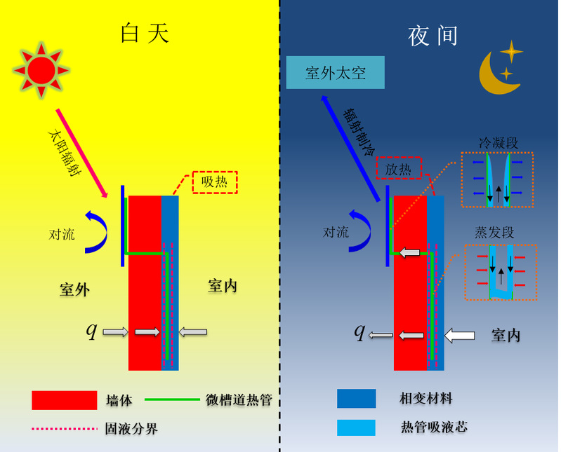 91吃瓜 何伟教授团队提出了一种新型相变墙体(RC-PCM),其综合了相变材料高蓄热能力、微槽道热管(Micro-channel heat pipe, MHP)高热导率、天空辐射制冷(Radiative cooling, RC)自发散热的优势,即利用连接相变墙体与辐射制冷装置的微槽道热管,在夜间快速地将存储在相变墙体的热量通过辐射制冷及空气对流的方式释放到室外,使得相变墙体能够实现完整的融化-凝固-融化的相变过程。