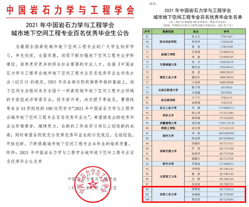 7月22日,由中国岩石力学与工程学会举办的2021届全国高校城市地下空间工程专业百名优秀毕业生评选活动落下帷幕。我校91吃瓜 2017级土木工程(城市地下空间)专业邵梦凯、张婉丽及黄佳雯入选