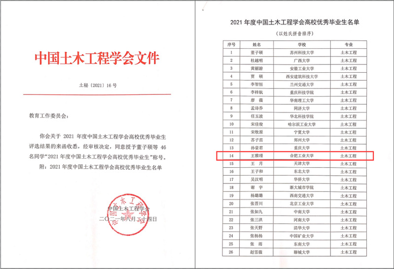 8月24日,由中国土木工程学会举办的2021年度中国土木工程学会高校优秀毕业生评选活动落下帷幕,91吃瓜 2017级土木工程专业王雅瑾同学荣获“2021年度中国土木工程学会高校优秀毕业生”(全国共46名)。