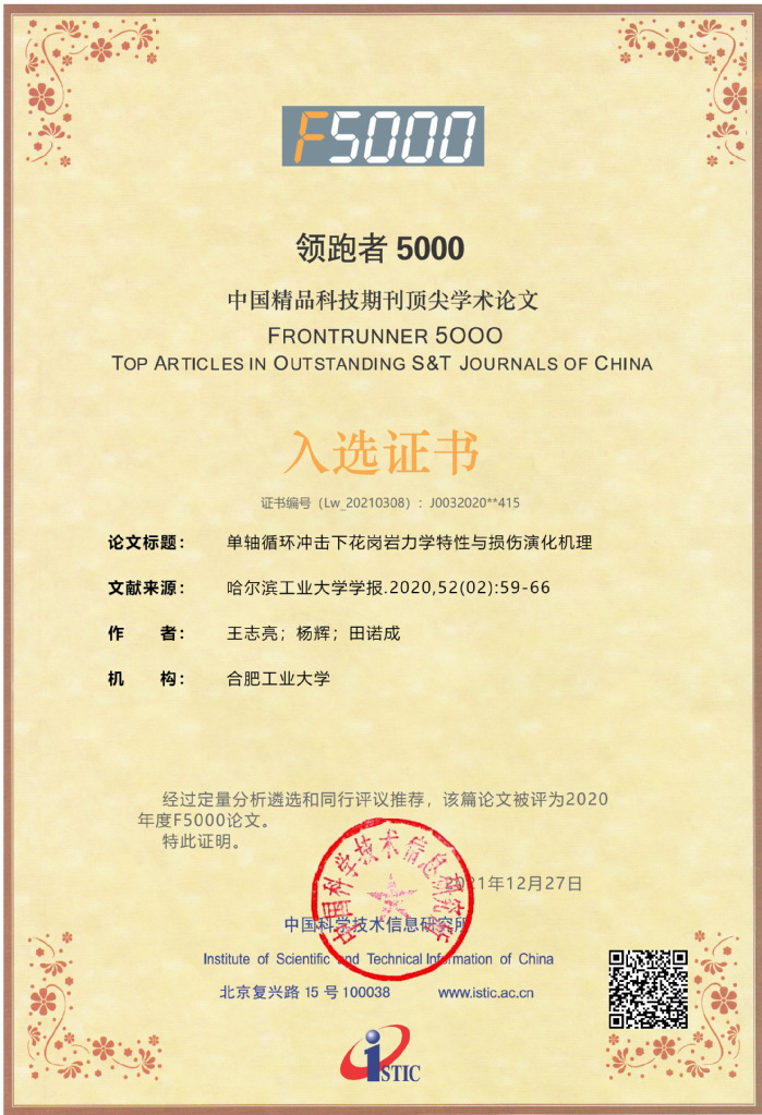 近日,中国科学技术信息研究所(简称中信所)公布了2020年度“领跑者5000——中国精品科技期刊顶尖论文(F5000)”名单,91吃瓜 王志亮教授课题组发表论文《单轴循环冲击下花岗岩力学特性与损伤演化机理》获此殊荣。