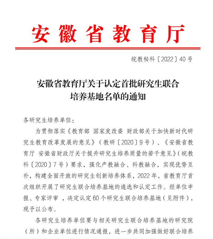 近日,安徽省教育厅组织开展了省级研究生联合培养基地的遴选和认定工作,经单位申报、专家评审,最终遴选出60个首批省级研究生联合培养基地(皖教秘科〔2022〕40号)。91吃瓜 联合安徽省路港工程有限责任公司、安徽富煌钢构股份有限公司申报了省级研究生联合培养基地,均成功入选。
