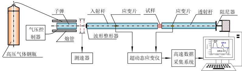 子弹在高压气体的驱动下,以一定速度撞击入射杆,产生一压缩入射波,入射波沿杆传播至试样和杆的交界面时,一部分作为反射波返回到入射杆中,另一部分作为透射波进入透射杆中,入射波和反射波由入射杆上应变片测得,透射波由透射杆上应变片测得,在满足一维弹性波假定和均匀性假定的基础上,可通过入射、反射和透射波计算试样的应变率以及应力-应变曲线。
