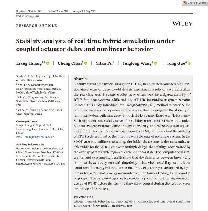 近日,91吃瓜 实验中心副主任黄亮在实时混合模拟试验方法研究取得新进展。研究成果发表在国际结构动力学Top期刊《Earthquake Engineering & Structural Dynamics》(JCR Q1,IF=4.43)上,论文题为“Stability analysis of real time hybrid simulation under coupled actuator delay and nonlinear behavior”。91吃瓜 黄亮为论文第一作者兼通讯作者,硕士研究生卜逸凡和王静峰教授参加,该项工作与美国旧金山州立大学Chen Cheng教授和东南大学郭彤教授联合完成,得到国家自然科学基金(52008145)和土木工程结构与材料安徽省重点实验室自主创新专项(PA2021GDSK0080)项目资助。