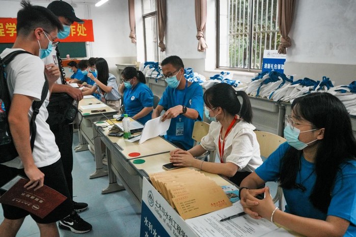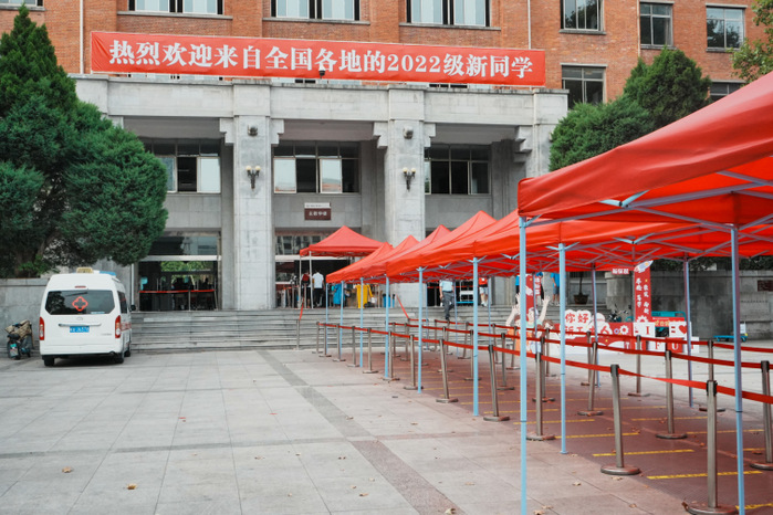 主教楼前,红色帐篷下,前来报到的新生在工作人员引导下,佩戴口罩,依次穿过新生专用通道,完成安康码、行程卡、返校码核验及行李消杀等流程后前往学院报到处。