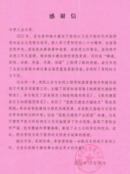 一封感谢信,充分肯定了我校土木工程学科在安徽省的引领作用和建设成效显著,勇担社会责任,服务地方发展。下一步,我校秉承“工业报国”初心使命,持续加强内涵建设,推进多学科交叉融合,推进产学研用合作模式深化升级,主动服务国家战略和安徽经济社会发展。新的一年,我校将踔厉奋发、勇毅前行,继续为国家和安徽省城乡建设、绿色发展贡献力量。