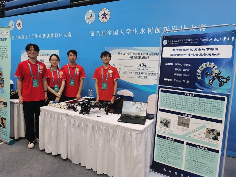 决赛经过现场作品演示以及参赛队员答辩,我校学子展现出了良好的精神面貌和专业素养,获得了评委专家和兄弟院校参赛师生的一致好评。王艳巧、刘康指导,李泽一、李金珂、谢其龙、韩艺苗、依地热斯·伊米尔同学设计的《基于仿生学的复杂地下管网清淤检测一体化智能管道助手》获特等奖;景月岭、张瑞钢指导,孙一品、高彦泽、李骥驰、曹恒、张津硕同学设计的《基于水空一体化调控凤眼莲的水体富营养化防治平台》获一等奖。