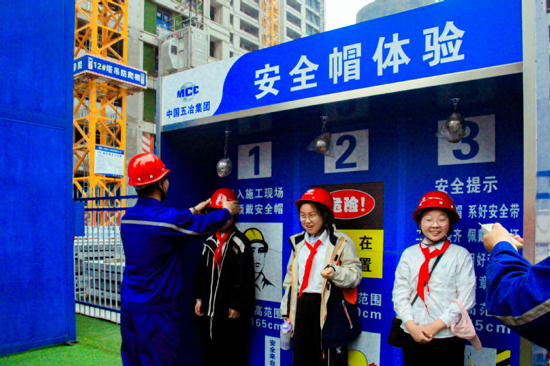 在皖投云启锦上花园项目活动现场,学院“蓝天社”志愿者为少先队员开展了一堂精彩的“工程小课堂”。青少年同学们在工作人员的指引下,参观了先进的装配式建筑施工工艺,激发了“小小工程师”的学习兴趣。大家在现场技术人员的指导下进行了火灾消防、防高空坠物、安全用电体验等活动。这些体验活动类型丰富、新奇直观。活动通过对少儿工程建设知识的启蒙,增进了其安全劳动意识。