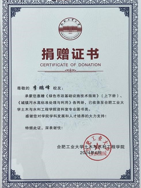 心系母校,情存土木,浓浓书香,传递真情。今年4月,2004届给排水工程专业校友李鹏峰向学院捐赠其参编的著作《绿色市政基础设施技术指南》(上下册)和《城镇污水高标准处理与利用》各两册,现已存入学院资料室专业图书类。