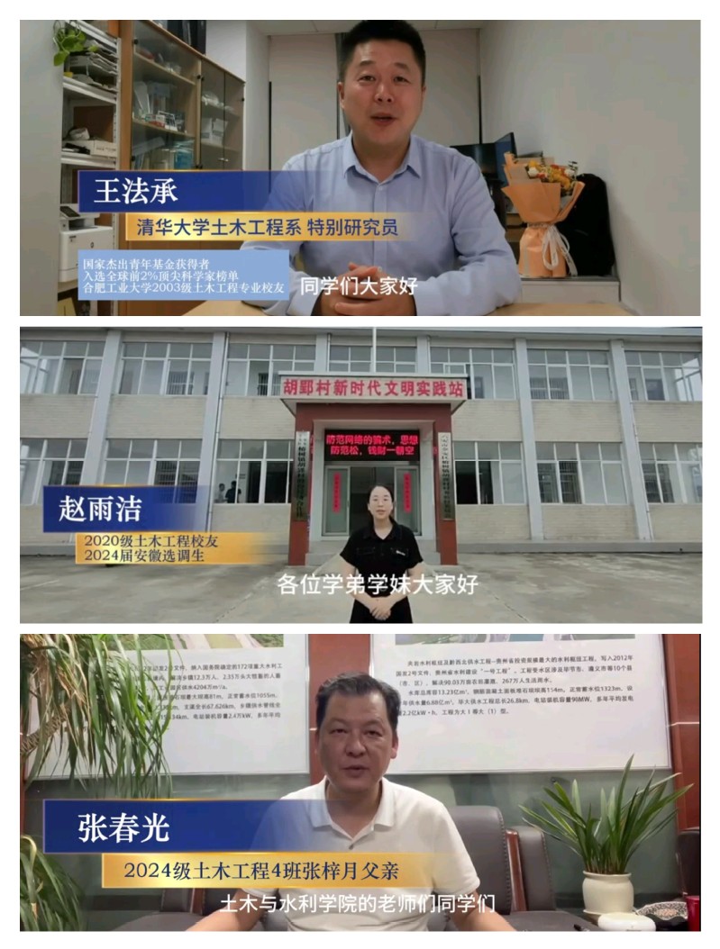 校友代表土木工程专业2007届校友、清华大学土木工程系特别研究员王法承,土木工程专业2024届校友安徽选调生赵雨洁以及2024级新生家长代表张春光通过视频向同学们送来寄语和祝福。