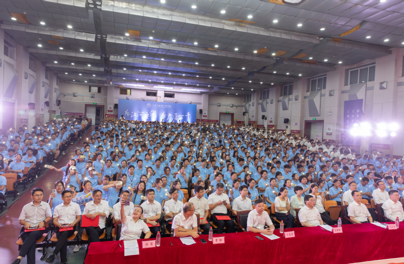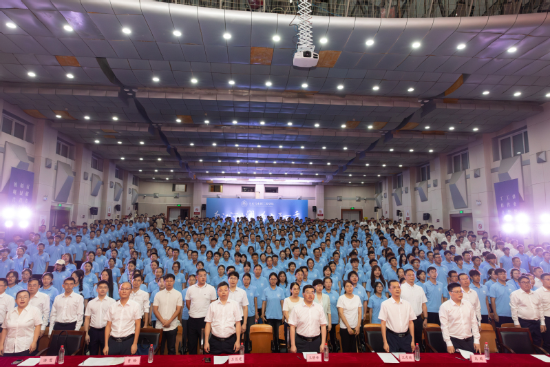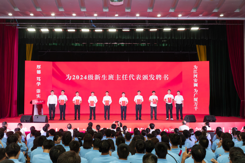 在2024级辅导员许晓龙老师的带领下,全场新生高举右拳、集体宣誓。师生们的誓言铿锵有力,彰显了土木学子“为江河安澜,为广厦万千”的崇高使命与坚定信念。