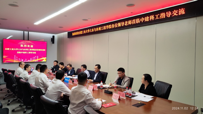 王东坡书记介绍了学校与学院的发展历程与取得的成就,同时学院育人成果丰硕,桃李遍布安徽省乃至全国各行各业,希望能与优秀校友及企业不断加强交流合作,并向科工及校友发出邀请,参加学院80周年庆活动,共商学院未来发展。王静峰院长对中建科工集团的人才战略与产业发展表示了肯定,对陈磊校友的热情接待表示了感谢。他指出希望双方加强科研合作,尤其是土木工程智能化相关板块等;在校企育人方面加强合作,加大优秀毕业生输送,开展研究生校企共同培养探索;双方共同开展培训赋能,为企业培养提升人才队伍建设;特别是目前学院的发展方向与中建科工的主营创新业务契合度很高,在科研合作,业务协同和成果转化方面有着良好的合作前景。