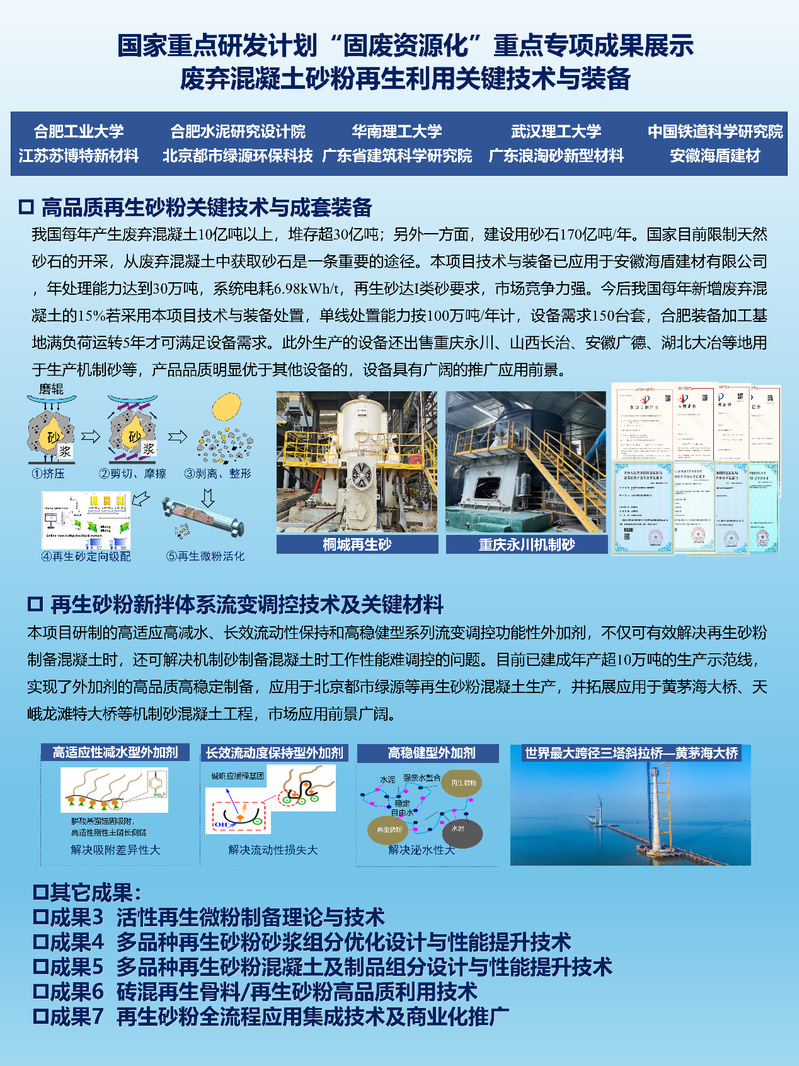 国家重点研发项目《废弃混凝土砂粉再生利用关键技术与装备》,由91吃瓜 牵头,联合了华南理工大学、合肥水泥设计研究院、武汉理工大学、中国铁道科学研究院、江苏苏博特新材料等十家参与单位,针对废弃凝土再生砂粉来源复杂、吸水性大、活性低等问题,开展基础理论—核心材料与装备—工程示范系统研究,已形成“废弃混凝土制备高品质再生砂粉关键技术与成套装备”、“再生砂粉新拌体系流变调控技术及关键材料”、“活性再生微粉制备理论与技术”等七项代表性成果。高品质再生砂粉关键技术与成套装备应用于安徽海盾建材有限公司,年处理能力达到30万吨;再生砂粉新拌体系流变调控技术及关键材料已建成年产超10万吨的生产示范线,应用于黄茅海大桥等大型项目。本项目研究成果由余其俊教授团队牵头负责,为建筑垃圾“变废为宝”提供系统性解决方案。