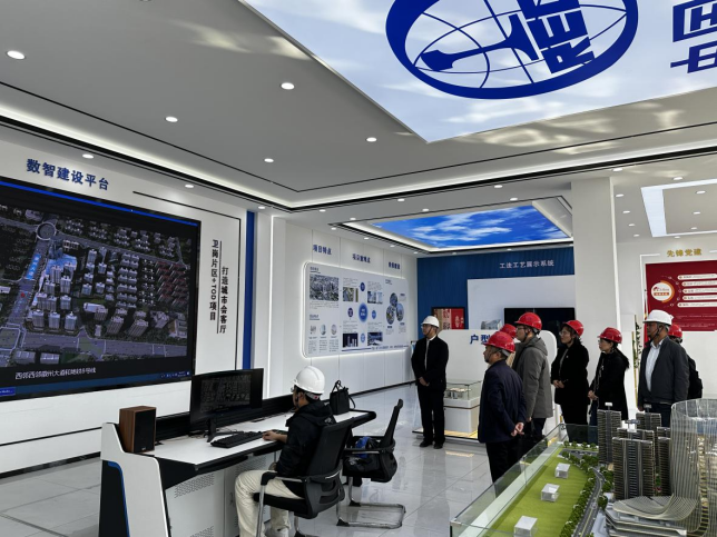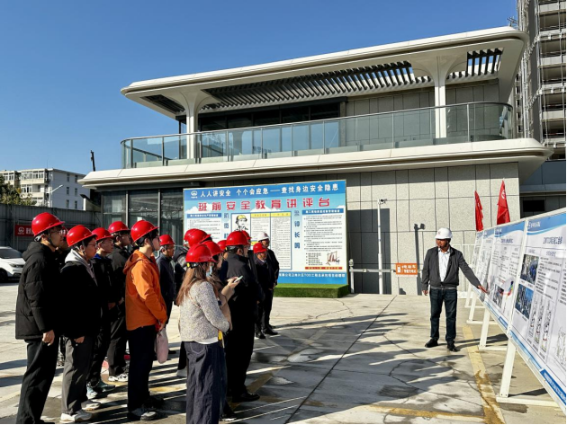 师生党员移步项目信息化室及产业工人社区进行实地参观。项目部负责人王龙五对卫岗片区TOD工程总承包项目作了详细介绍该项目是全国首批城市更新推广合肥市首个“TOD+城市更新”综合性开发项目。项目部构建的数字建设平台,实现了以BIM+数字孪生和AR实景为核心的“双平台系统”信息化应用。该系统集成BIM、GIS、物联网、远程视频及AI识别等多项技术,兼具作业环境的数字孪生与实景呈现功能,并支持作业过程对讲与管理数据的动态分析。师生党员们切身感受到了智慧工地的实际发展及其应用成效,深刻体会到科技创新对建设领域的全面赋能。