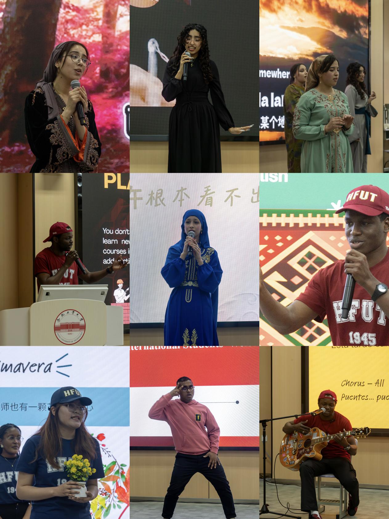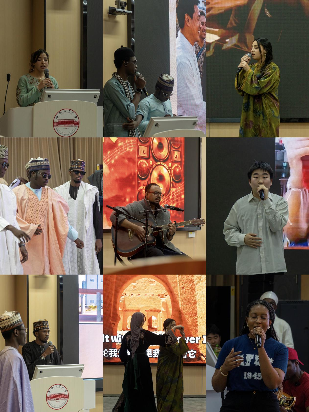 汇演在活力四射的开场舞中拉开帷幕,留学生们用动感的节奏和热情的舞步瞬间点燃了现场气氛。本次汇演节目形式多样,内容丰富,既有展现异域风情的民族歌舞,也有融合中华文化的才艺展示。来自安哥拉、缅甸、莫桑比克、孟加拉国、尼日利亚、摩洛哥等国家的留学生们纷纷登台,带来了极具本国特色的传统舞蹈与歌曲。华丽的民族服饰、悠扬的异域旋律与独特的乐器演奏,让现场师生仿佛置身于一场“世界文化博览会”,掌声与欢呼声此起彼伏。