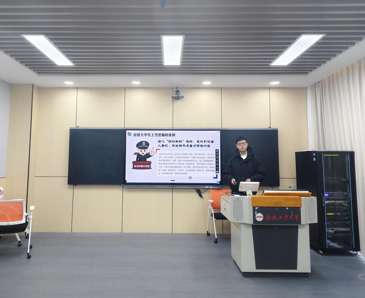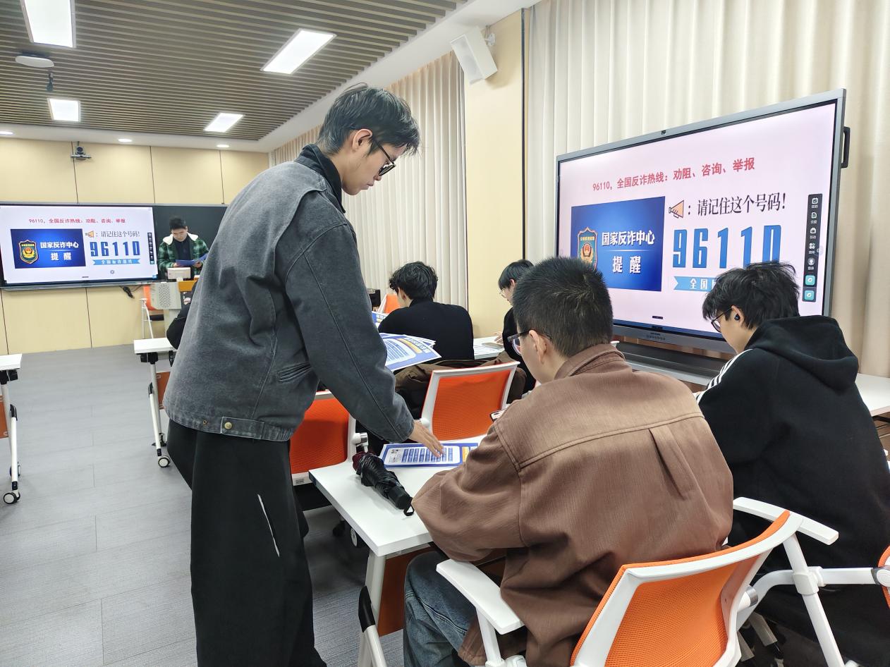 解鑫威围绕校园高发的刷单返利、冒充客服退款、校园贷等诈骗类型,剖析了作案手法与话术套路,帮助同学们认清诈骗分子的设局与诱导过程。他结合在校学生受骗的真实案例,让同学们直观感受到诈骗就在身边。随后播放的反诈宣传视频进一步揭示了诈骗分子的逻辑漏洞,引导学生摒弃“自己不会上当”的侥幸心理。解鑫威重点强调了防范电信诈骗的“四不原则”——不轻信、不透露、不转账、不贪心,并提醒同学们牢记全国反诈热线96110,遇到可疑情况及时咨询或举报。活动期间,2025级研究生尹一博同学同步发放防诈骗宣传单,将关键防范信息送到同学们手中,并引导大家关注学校官方反诈公众号“工大卫士”,及时获取最新骗术提醒。