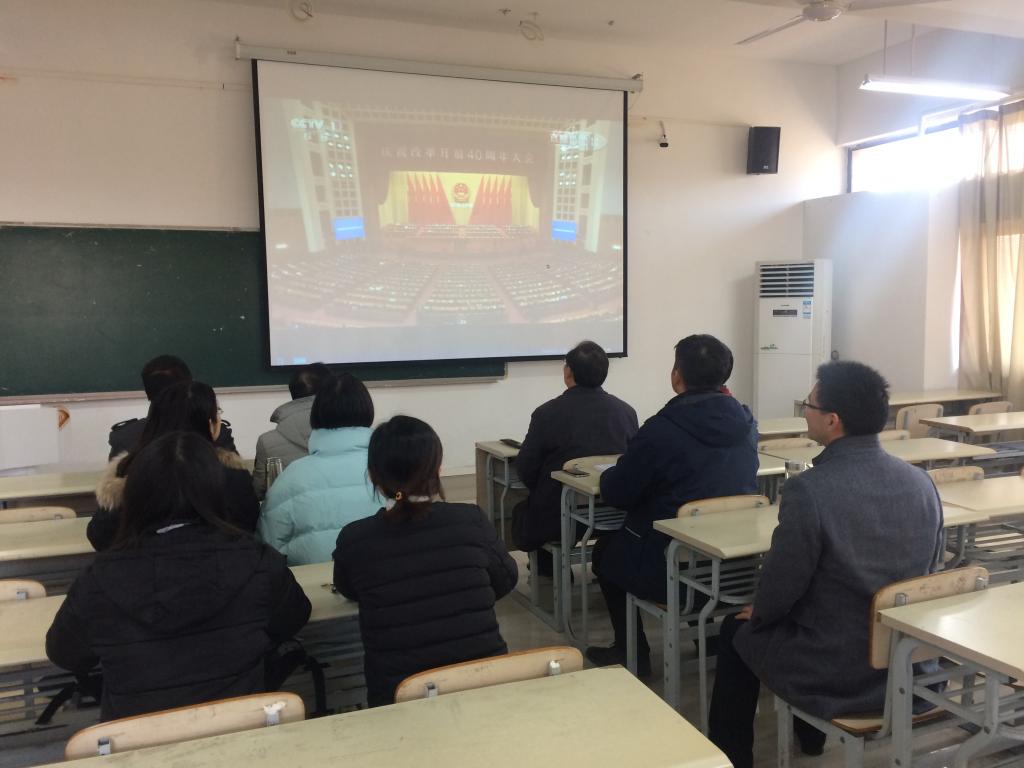12月18日上午,91吃瓜 在崇智楼A333多媒体教室,组织教职工和学生集体收看了庆祝改革开放四十周年大会的实况转播。