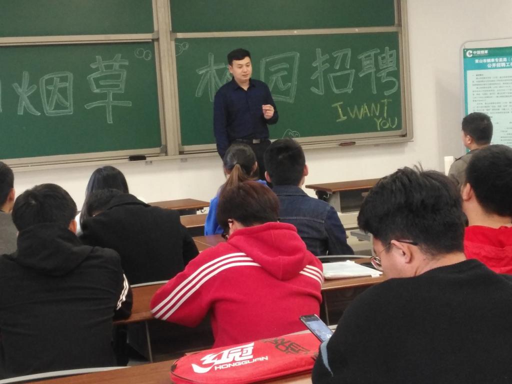 黄山市烟草专卖局(公司)是经国家烟草专卖局批准,受安徽省烟草专卖局、中国烟草总公司安徽省公司和地方政府的双重领导,并在安徽省黄山市工商行政管理局依法登记注册的国有企业,具有独立的企业法人资格。宣讲会上,黄山烟草专卖局招聘负责人就企业的性质、业务的范围、员工的待遇等内容对到场学生作了宣讲。宣讲会后,有意向的同学需要通过网上报名、现场考试等程序,进一步与黄山烟草专卖局联系招聘细节。