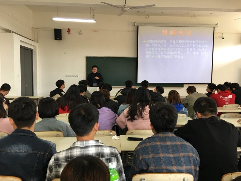 报告中,郑红伟从烙画的起源、烙画材料与工具、烙 画 技 法和烙画表现形式等方面给大学生们带来了一场学术盛宴。郑红伟深入浅出,语言幽默,讲到精彩之处,大家报以热烈的掌声。