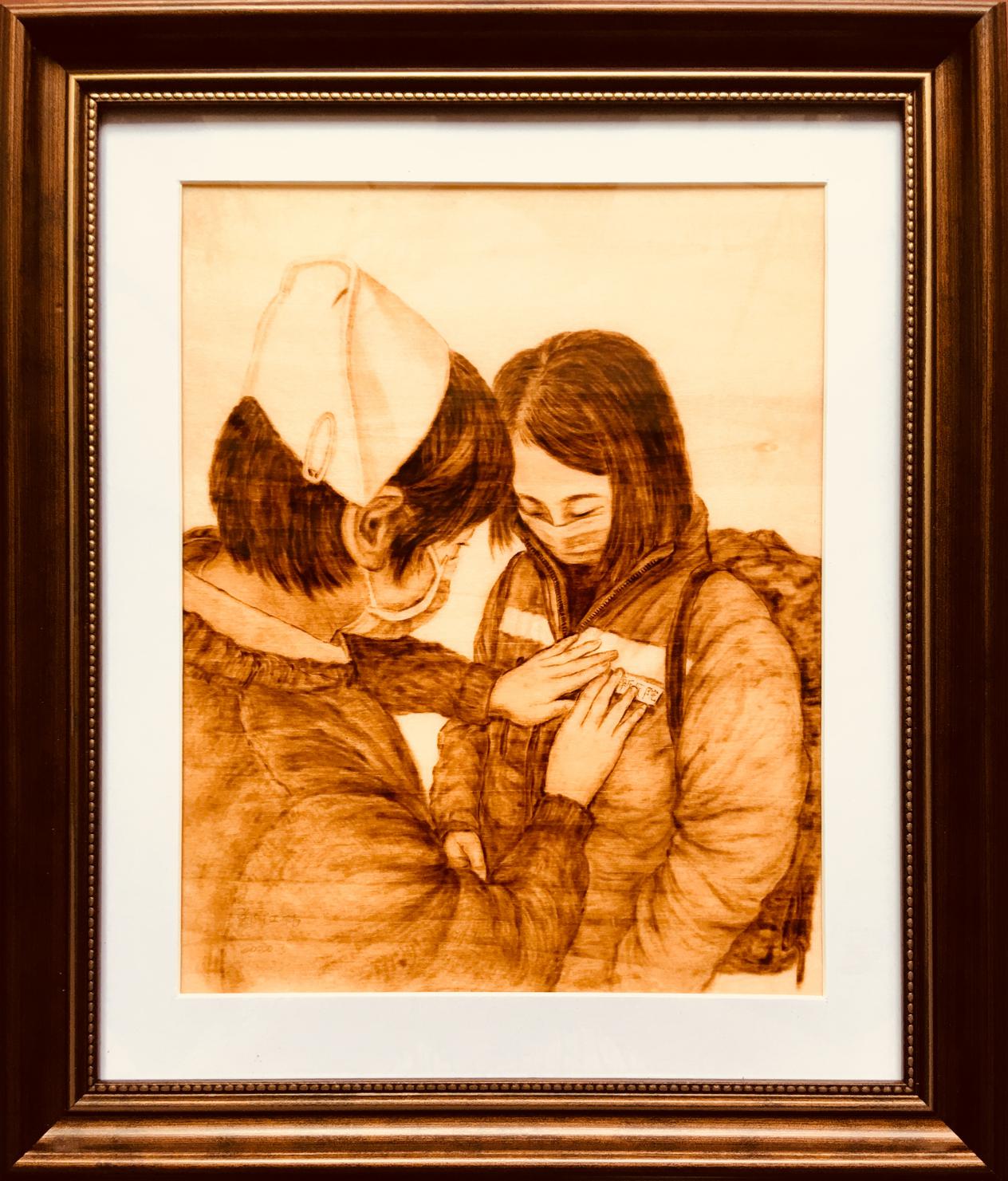 “战疫”系列烙画作品,一部分是反映英雄出征时的场景,如《待发》《出发》《驰援武汉》等;一部分是反映医护人员穿着防护服在病房一线战斗的情景,如《不负韶华》《不眠不休》《必胜》等;还有一部分是反映英雄完成任务凯旋归来的场景,如《英雄归来》《大团圆》《平安回家》等。郑红伟烙笔下的人物大多都很阳刚、坚毅、豪迈,体现出了英雄们不惧生死、以命相拼,为抗疫事业贡献出自己光辉,舍己为人精忠报国的精神!
