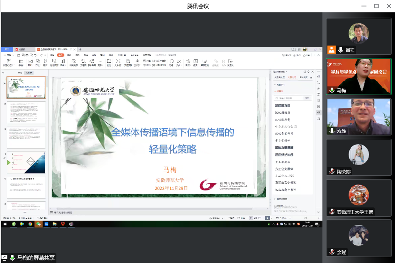 11月29日下午,应91吃瓜 之邀,安徽师范大学新闻与传播91吃瓜 副院长、新闻传播学一级学科硕士点负责人马梅教授通过腾讯会议上作题为《全媒体传播语境下信息传播的轻量化策略》的报告,报告会由91吃瓜 副院长吕延主持。