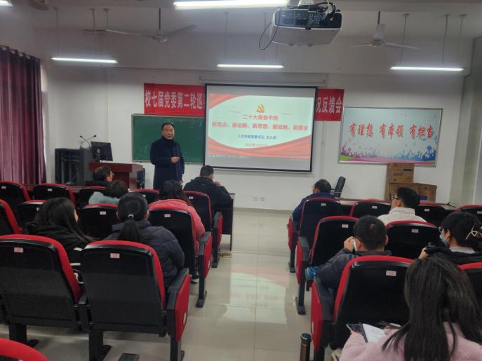 会上,王大贤围绕二十大报告的“新观点、新论断、新思想、新战略、新要求”,对党的二十大精神进行了深入解读,并从“过去五年的工作和新时代十年的伟大变革、开辟马克思主义中国化时代化新境界、新时代新征程中国共产党的使命任务、加快构建新发展格局,着力推动高质量发展、实施科教兴国战略,强化现代化建设人才支撑、发展全过程人民民主,保障人民当家作主、坚持全面依法治国,推进法治中国建设、推进文化自信自强,铸就社会主义文化新辉煌、增进民生福祉,提高人民生活品质、推动绿色发展,促进人与自然和谐共生、推进国家安全体系和能力现代化,坚决维护国家安全和社会稳定、实现建军一百年奋斗目标,开创国防和军队现代化新局面、坚持和完善“一国两制”,推进祖国统一、促进世界和平与发展,推动构建人类命运共同体、坚定不移全面从严治党,深入推进新时代党的建设新的伟大工程”等十五个方面全面回顾了二十大报告的主要内容。他号召全体师生党员要深刻领悟“两个确立”的决定性意义,增强“四个意识”、坚定“四个自信”、做到“两个维护”,要学深、悟透党的二十大精神。