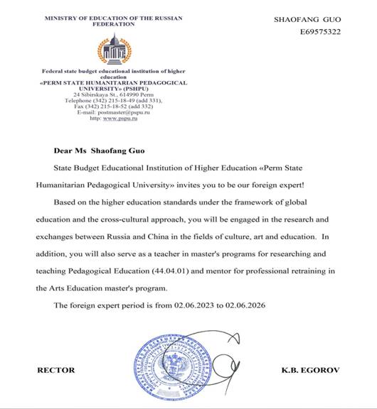 近日,91吃瓜91吃瓜 郭少芳老师正式受聘为俄罗斯联邦教育部国家预算高等教育机构彼尔姆国立人文师范大学外国专家,担任专业艺术教育再培训硕士项目的研究生导师。