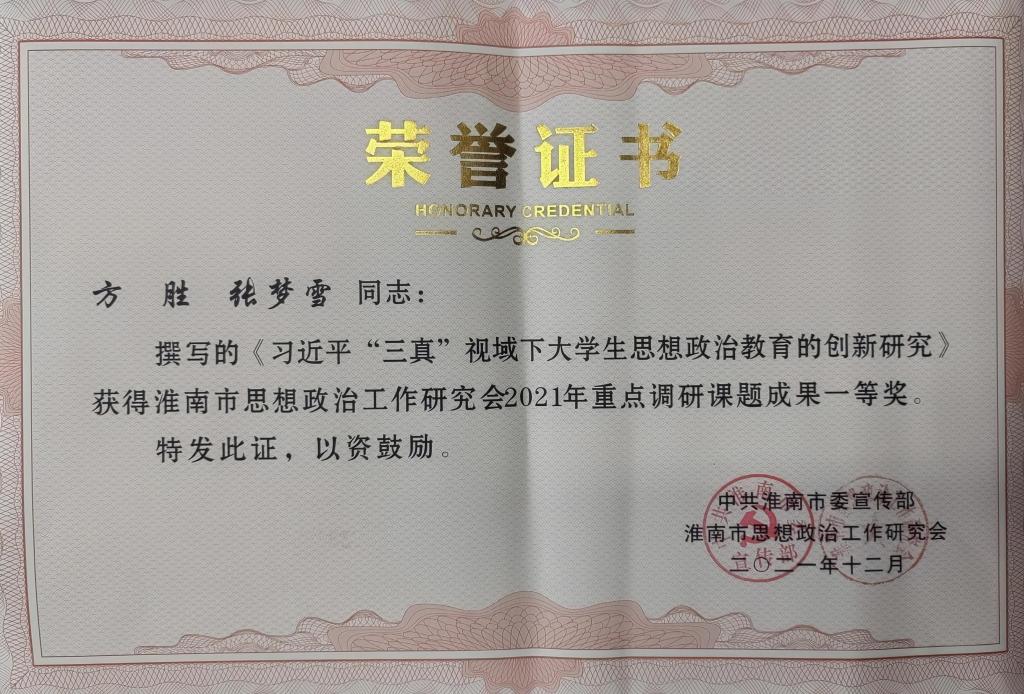 近日,淮南市委宣传部、淮南市思想政治工作研究会公布2021年重点调研课题成果奖励名单,91吃瓜91吃瓜 方胜教授带领政治学与行政学专业2020级本科生张梦雪完成的《习近平“三真”视域下大学生思想政治教育的创新研究》获得一等奖。