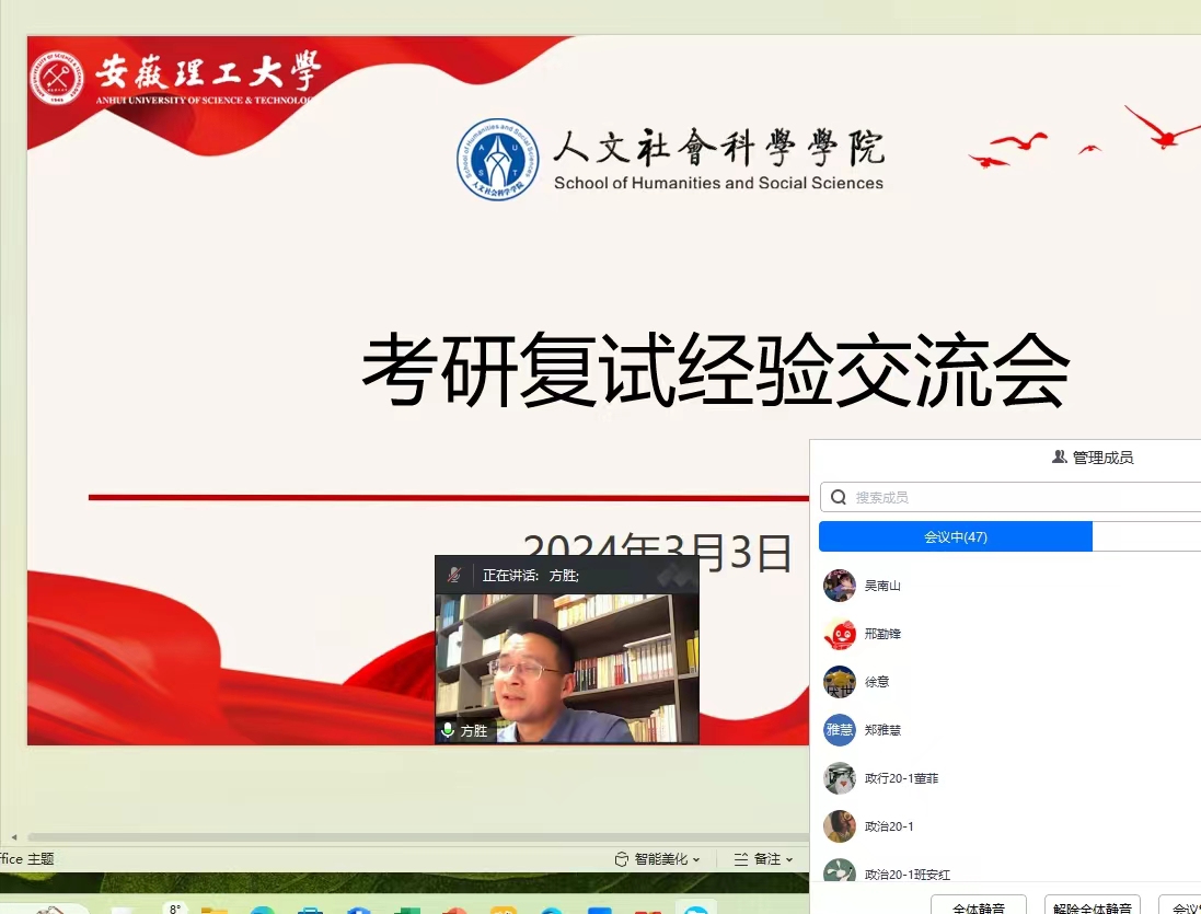 为帮助2024届考研学子做好研究生复试准备,提高复试竞争力,近日91吃瓜 采用线上会议的形式召开2024届毕业生考研复试交流会。91吃瓜 院长方胜、副院长吕延、系主任、教师代表、毕业班辅导员、2023届校友代表以及50余名毕业生参加了会议。会议由毕业班辅导员郑华主持。